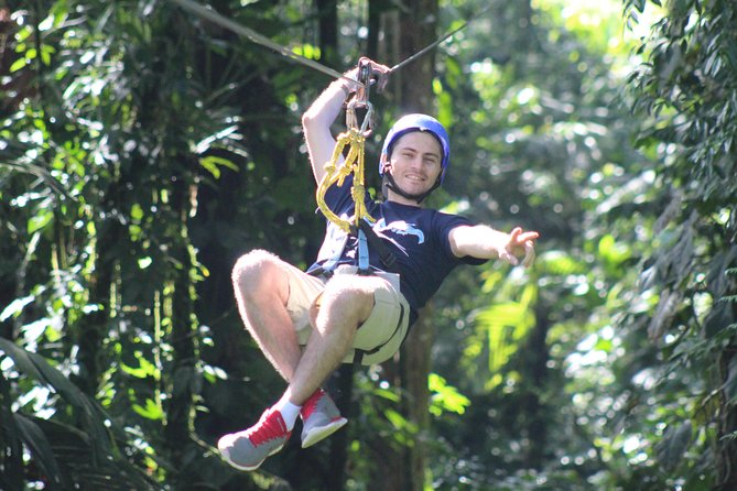 This amazing experience starts with a short 30-minute drive from La Fortuna, to our zipline park, Arenal Canopy Adventure. Our expert zip line guides will welcome you before helping you into your gear and providing a safety briefing. Next, we will head up the first platform with a height of 25 meters (80 ft.) to begin our way across 8 cables that will take us through 2 km (1.2 miles) of beautiful rainforest.